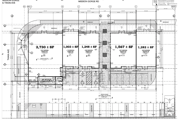 Approximately 7,830 SF center abutting the signalized corner of Mission Gorge and Twain. The site has street frontage giving it fantastic visibility. Parking behind. The surrounding community was recently rezoned to allow for dense housing and is currently exploding with growth!! Thousands of apartment units under construction or completed. The upzoning in 2018 has compounded with state and city laws increasing density to allow for well over 20,000 new residential units. See the brochure for more details on nearby projects. Site is conveniently located between SDSU and its new campus. Two Kaiser Medical Centers and a Kaiser office are also in the community.